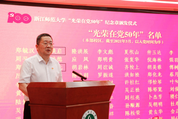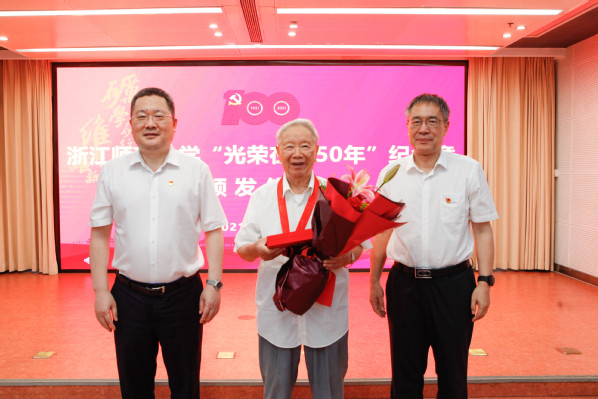 “老前辈,这是中共中央向您颁发的纪念章!”日前,“光荣在党50年”纪念章颁发仪式在浙江师范大学行政中心多功能会议室举行。浙师大党委书记蒋国俊,校长郑孟状,校党委委员、组织部、统战部部长吕迎春出席仪式。表彰大会由校党委副书记邵国平主持。