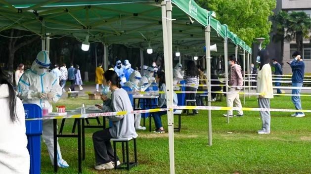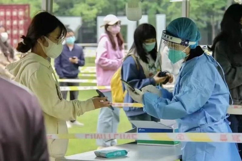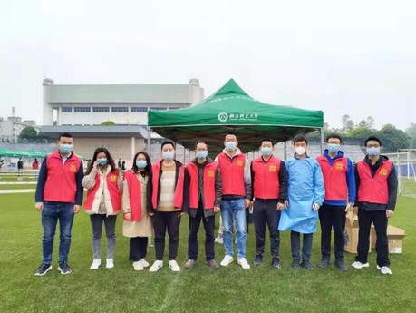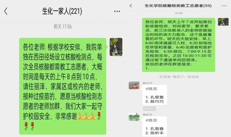 生化学院师生党员积极作为,全员核酸检测启动后,20余人的教师志愿者队伍,仅在5分钟内完成招募;55名教师志愿者,挑起了学院4天的全员核酸检测重担。