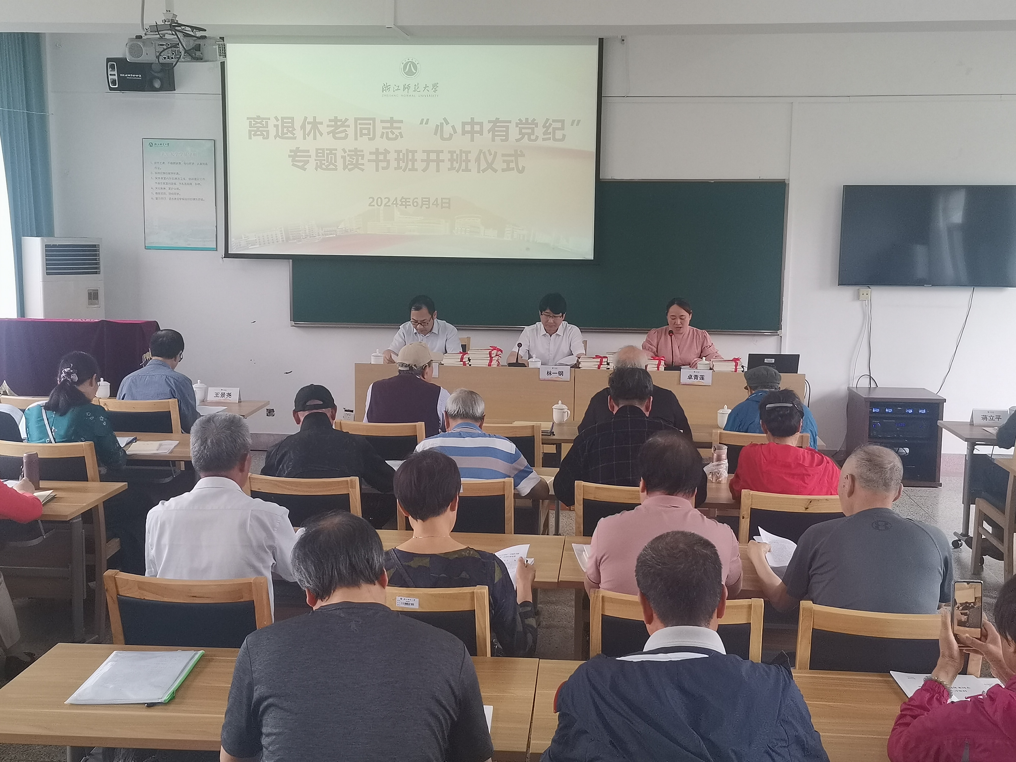 为深入学习贯彻习近平总书记关于党纪学习教育的重要讲话和重要指示精神,引导广大离退休干部党员学纪、知纪、明纪、守纪,6月4日,浙江师范大学机关离退休党委举办离退休老同志“心中有党纪”专题读书班。副校长林一钢出席开班仪式并讲话,离退休工作处处长、机关离退休党委书记卓青莲主持开班仪式,组织部副部长阮春锋、校老领导,机关离退休党委委员、纪委委员,离退休党支部书记、老年活动中心骨干、行政小组长等70余人参加了开班仪式。